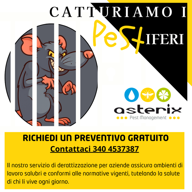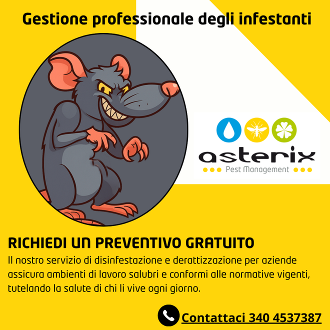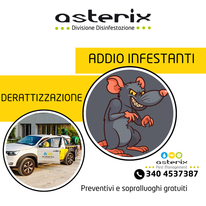 I servizi di derattizzazione che proponiamo noi di Asterix sono molto puntuali e in grado di liberarvi dalla presenza di ospiti poco graditi in pochissimo tempo e in modo definitivo.